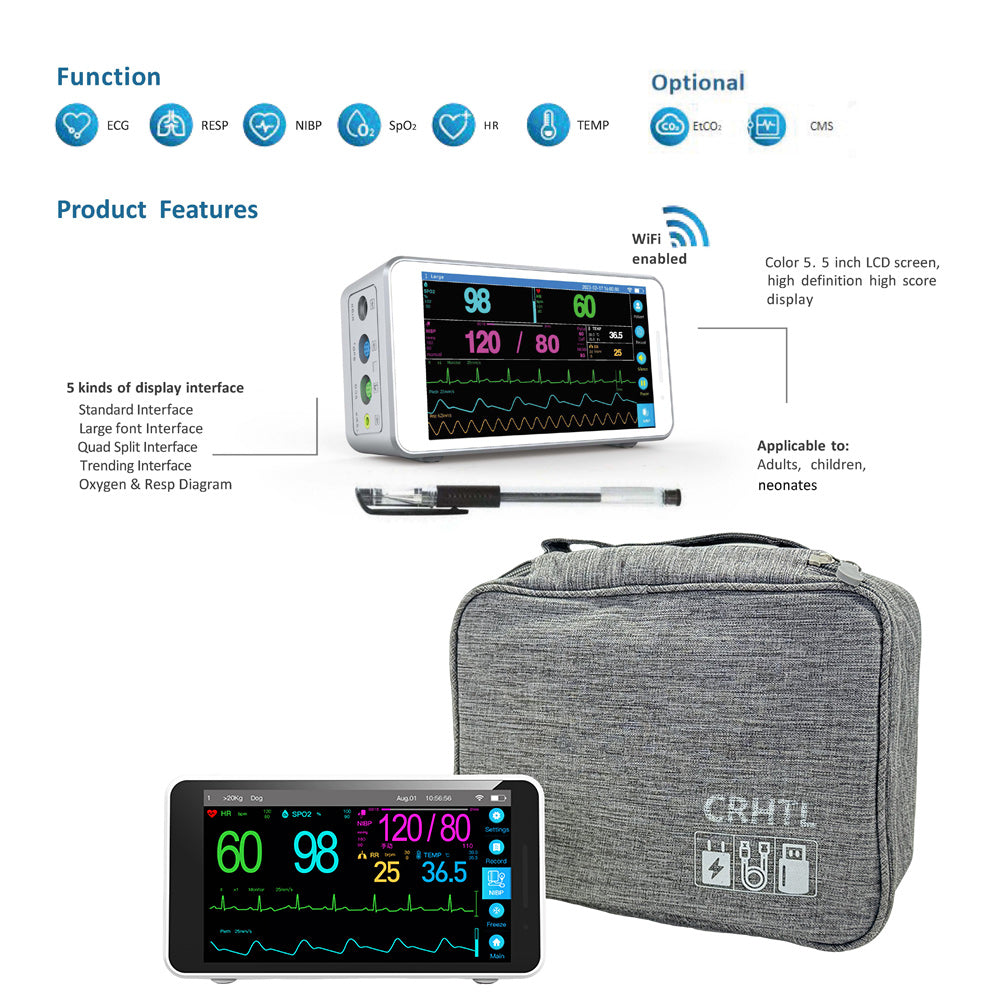 Monitor de paciente portátil con pantalla táctil de 5,5 pulgadas, tamaño pequeño, operación simple, fácil de transportar, adecuado para una variedad de lugares.